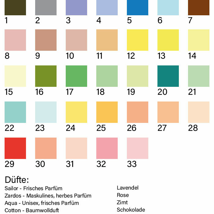 Unsere feste Seife ist in mehr als 30 unterschiedlichen Farben erhältlich – von zarten Pastelltönen über natürliche Grüntöne bis hin zu kräftigen, auffälligen Nuancen. So lässt sich jedes Seifenstück optimal auf Ihr Corporate Design oder den gewünschten Anlass abstimmen. Ergänzend dazu stehen verschiedene Düfte zur Auswahl, die jeder Seife ihren eigenen Charakter verleihen: „Sailor“ mit einer frischen, maritimen Note, „Zardos“ als maskulin-herbes Parfüm sowie „Aqua“ als leichte, unisex-frische Variante. „Cotton“ duftet dezent nach frisch gewaschener Wäsche – sauber, weich und angenehm pudrig. Zudem bieten klassische Duftnoten wie Lavendel, Rose, Zimt und Schokolade warme, aromatische Akzente. Diese Vielfalt macht jede Seife zu einem individuell gestaltbaren, hochwertigen Produkt.